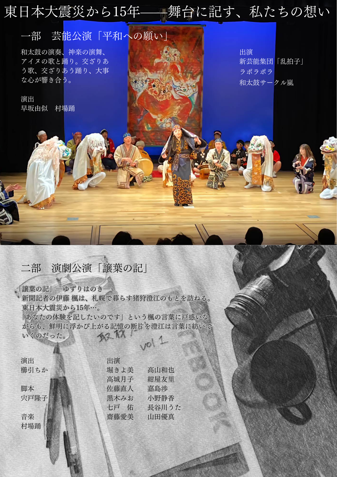 作品に対する思い。東日本大震災と東京電力福島第一原子力発電所の事故から15年が経過しようとしています。すでに終わったこと…復興という言葉すら、すでに過去になりかけているけれど、実はなにも終わっていない。澄江「私たちがいなくなったとき、すべてはなかったことにされる…。」演劇は、それを観た人の胸に、小さな楔をうちます。悲しいことが繰り返されないように、少しでも考えるきっかけを誰かに持ってもらえたら…。そんな思いでこの脚本を書きました。